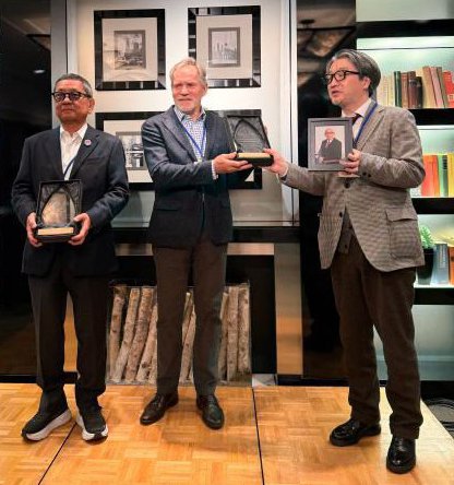 功労賞の授与(左から:安部次郎氏、ホセ・ルイス・セビジャーノ氏、内海庸介MPN事務局長(椎名和夫氏の代理))